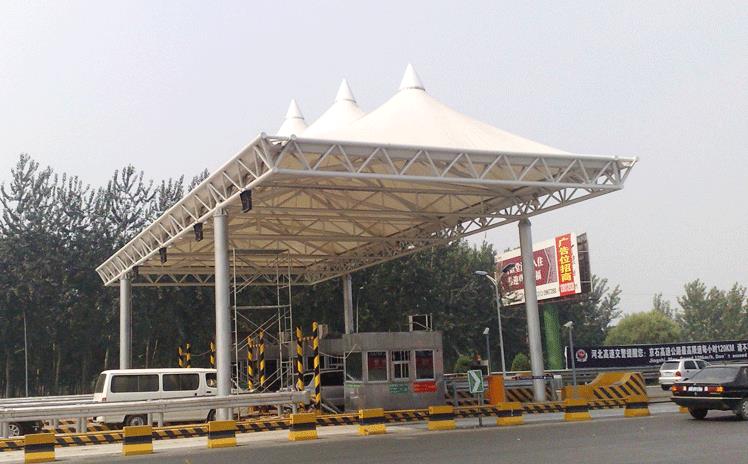 3、国产PTFE膜结构膜布用于高速路口的收费站交通棚,其独特的牢固性和安全性可以保证使用寿命在30年以上。
